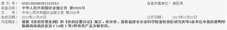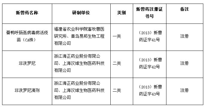 根據(jù)《獸藥管理條例》和《獸藥注冊辦法》規(guī)定,經(jīng)審查,批準(zhǔn)福建省農(nóng)業(yè)科學(xué)院畜牧獸醫(yī)研究所等4家單位申報的番鴨呼腸孤病毒病活疫苗(CA株)等3種獸藥產(chǎn)品為新獸藥,現(xiàn)核發(fā)《新獸藥注冊證書》,并發(fā)布產(chǎn)品制造及檢驗試行規(guī)程、質(zhì)量標(biāo)準(zhǔn)、說明書和標(biāo)簽,自發(fā)布之日起執(zhí)行。