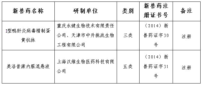 根據(jù)《獸藥管理?xiàng)l例》和《獸藥注冊(cè)辦法》規(guī)定,經(jīng)審查,批準(zhǔn)重慶永健生物技術(shù)有限責(zé)任公司等3家單位申報(bào)的I型鴨肝炎病毒精制蛋黃抗體等2種獸藥產(chǎn)品為新獸藥,現(xiàn)核發(fā)《新獸藥注冊(cè)證書》,并發(fā)布產(chǎn)品試行規(guī)程、質(zhì)量標(biāo)準(zhǔn)、說(shuō)明書和標(biāo)簽,自發(fā)布之日起執(zhí)行。