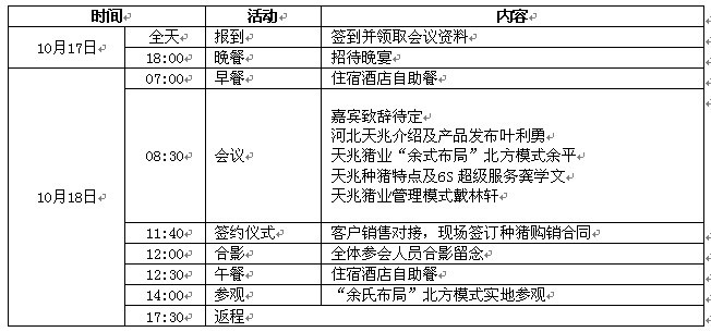 2014年10月,河北天兆第一批經(jīng)過測(cè)定的優(yōu)質(zhì)種豬即將上市,標(biāo)志著天兆豬業(yè)在北方地區(qū)將初步形成豬場(chǎng)合作拓展、種豬生產(chǎn)和銷售一體化的養(yǎng)豬產(chǎn)業(yè)化發(fā)展模式。為此,首屆北方養(yǎng)豬高峰論壇暨河北天兆種豬上市新聞發(fā)布會(huì)將于2014年10月18日在河北省張家口市召開,現(xiàn)將有關(guān)事宜通知如下: