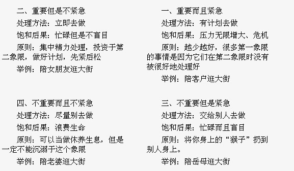 質(zhì)量管理時間觀之二——站對象限,積極主動。衡量一個質(zhì)量人的時間觀是否正確,不僅僅是看他花在工作上的時間,更應(yīng)看花在那些事情上,如果是被動式反應(yīng),被動地處于救火員的身份上,不是消防員的思維,那么此類質(zhì)量管理者又有多少含金量呢?因此我們必須緊盯質(zhì)量管理方針和目標(biāo),站對時間管理的象限(處理方法參見如下附圖),利用”PDCA”循環(huán)快速予以推進(jìn)和落實。