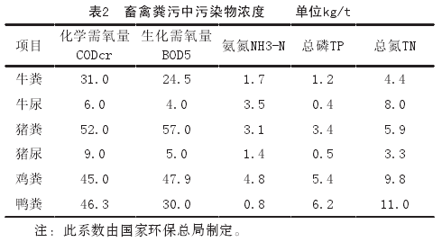 畜禽排泄物、養(yǎng)殖場生產(chǎn)污水、糞堆露天堆積經(jīng)過雨水沖刷,不經(jīng)處理肆意排放,其中,含有大量有毒有害物質(zhì),污水會大量傳播人畜共患病,人畜共患的傳染病至少有90余種,經(jīng)測定,養(yǎng)殖場所排放的污水平均含大腸桿菌3.3×105個/ml和腸球菌6.6×105個/ml,沉淀池內(nèi)的污水平均含蛔蟲卵和毛首線蟲卵分別達19313個/ml和106個/ml。高濃度的畜禽有機污水排入江河湖泊中,大量消耗水中氧,造成水質(zhì)不斷惡化,畜禽污水中的高濃度氮、磷是造成水體富營養(yǎng)化;滲入地下也會造成嚴(yán)重污染。它可使地下水溶解氧含量減少,水質(zhì)中有毒成分增多,嚴(yán)重時使水體發(fā)黑、變臭,失去使用價值;污水流入河流、池塘可使藻類等浮游生物大量繁殖,產(chǎn)生各種毒素,嚴(yán)重污染水體。畜禽糞污中污染物濃度計算見表2。