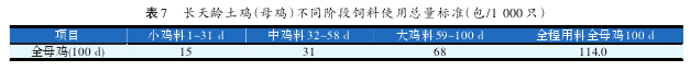 4.3.4根據(jù)以上分析,上市肉雞飼料增重比最低、次雞率最高時(shí),其各階段飼料使用總量數(shù)據(jù),對(duì)于指導(dǎo)大生產(chǎn)具有重要的參考價(jià)值,可看作長(zhǎng)天齡土雞(母雞)不同階段飼料使用總量料量標(biāo)準(zhǔn)(見(jiàn)表7)