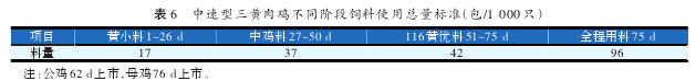 4.2.4根據(jù)以上分析,上市肉雞飼料增重比最低、次雞率最高時(shí),其各階段飼料使用總量數(shù)據(jù),對(duì)于指導(dǎo)大生產(chǎn)具有重要的參考價(jià)值,可看作中速型三黃肉雞不同階段飼料使用總量料量標(biāo)準(zhǔn)(見(jiàn)表6)