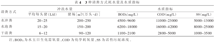 豬場(chǎng)廢水來(lái)源于豬只排放的尿液、沖洗糞便產(chǎn)生的廢水、噴霧消毒或降溫產(chǎn)生的廢水以及生活區(qū)產(chǎn)生的生活廢水等,其中尿液和沖洗糞便產(chǎn)生的廢水危害最大,同時(shí)這部分廢水也是豬場(chǎng)耗費(fèi)水資源的主要部分,豬場(chǎng)產(chǎn)生的廢水量大小取決于豬場(chǎng)采用的清糞工藝。目前清糞工藝主要有水沖糞、水泡糞(自流式)和干清糞3種方式,3種清糞方式耗水量及水質(zhì)指標(biāo)見(jiàn)表4。干清糞與水沖式、水泡式清糞相比具有肥料價(jià)值高、便于高溫堆肥或以其他方式處理利用、減少?zèng)_洗廢水中污染物的含量等優(yōu)點(diǎn),同時(shí)極大地減少?zèng)_洗用水,應(yīng)在國(guó)內(nèi)廣大豬場(chǎng)推廣,其缺點(diǎn)主要是浪費(fèi)勞動(dòng)力。而國(guó)外和我國(guó)養(yǎng)豬發(fā)達(dá)地區(qū)則普遍采用了水沖糞、水泡糞清糞工藝,其缺點(diǎn)則是初期建設(shè)投入較高。