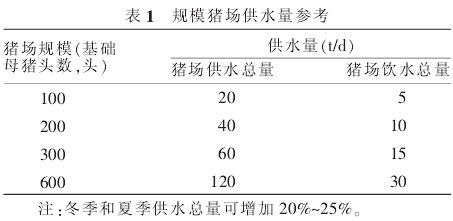 1.2水量豬場(chǎng)是耗水大戶,包括了生產(chǎn)用水、生活用水和綠化等實(shí)際用水情況。水源應(yīng)能穩(wěn)定地持續(xù)供應(yīng)所需滿足要求的合格水量。具體應(yīng)該根據(jù)豬場(chǎng)規(guī)模大小和附屬工程以及綠化等實(shí)際用水情況,確定豬場(chǎng)最高日需水量。豬場(chǎng)供水量計(jì)算參考表1。