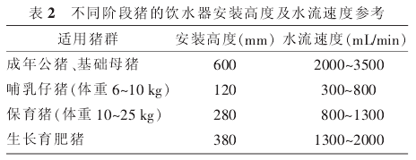 水源地勢(shì)高低(地下水水位高低)涉及的是打井的成本和水質(zhì)是否易被污染問(wèn)題,水塔/水池到豬舍距離涉及的是出水口水壓、水管材質(zhì)和使用壽命問(wèn)題,這2個(gè)因素通過(guò)系統(tǒng)規(guī)劃、科學(xué)評(píng)估和合理施工,再結(jié)合考慮不同類型、不同體重豬只對(duì)飲用水的需求量和飲用水消毒方法可以較好地解決。不同類型、不同體重豬只對(duì)飲用水的需求量見(jiàn)表2。