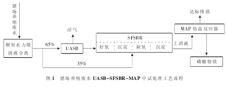 總之,在廢污處理問(wèn)題上,豬場(chǎng)應(yīng)該以“資源化利用、容量化控制、減量化處理、生態(tài)化發(fā)展和低廉化治理”為指導(dǎo)原則,不斷嘗試采用新技術(shù)新方法,如浙江省某豬場(chǎng)在固液分離預(yù)處理?xiàng)l件下,采用荷蘭Lettinga教授于1977年首先提出并不斷被改進(jìn)的“升流式厭氧污泥床—分步進(jìn)水序批式反應(yīng)器—反硝化除磷法”(UASB-SFSBR-MAP)處理凈化污物,既處理了污水又將廢水中的氮磷回收成產(chǎn)品磷酸銨鎂,值得推廣。該方法采用的技術(shù)路線圖見(jiàn)圖1。