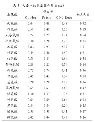 大麥中含有豐富的氨基酸,表3列出了3種大麥的氨基酸含量。由表3可以看出,大麥中的氨基酸組成比例比較合理。
