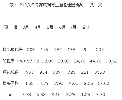 (1)幼蟲在皮下寄生情況。在流行區(qū)選7個(gè)點(diǎn),隨機(jī)確定210頭1~2歲育成牛逐月觸摸調(diào)查,檢出背部有皮蠅寄生形成瘤包的牛209頭,感染率99.52%。感染強(qiáng)度6~60個(gè),平均17(±7.7)個(gè),詳見表1。第一個(gè)瘤包出現(xiàn)在1月8日,第一個(gè)瘤包中的蟲體落地日期為3月12日,進(jìn)入4月,蟲體落地增多,最后一個(gè)瘤包消失日期為8月3日。