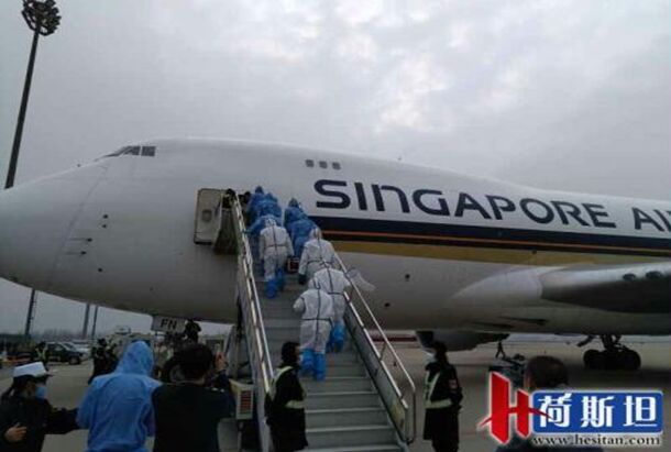 檢疫人員身穿防護服對牛箱中牛和飛機進行檢疫消毒