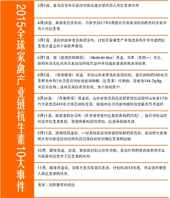 2015年1月27日-29日,在美國舉行的IPPE展會期間舉行的世界家禽科學大會上,與會專家對無抗家禽養(yǎng)殖議題展開了深入探討。此后麥當勞宣布在美國快餐店逐步禁用含人用抗生素雞肉。緊接著美國泰森食品公司、英國兩姐妹集團等公司相繼宣布逐步停用將促生長類抗生素用于家禽養(yǎng)殖。事實上,2014年2月11日,美國快餐連鎖店Chick-fil-A就宣布計劃在未來5年內(nèi)在全美所有的連鎖店內(nèi)提供不用抗生素飼養(yǎng)的雞肉。這個舉動也是快餐業(yè)第一次承諾提供100%“無抗生素飼養(yǎng)”的雞肉產(chǎn)品。