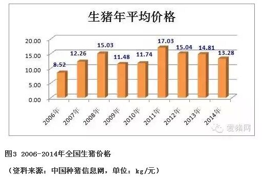 這9年生豬價格時起彼伏,2006年以來,全國生豬平均價格總體上呈現(xiàn)上揚(yáng)的態(tài)勢,2008、2011年價格比較高,最高點(diǎn)出現(xiàn)在2011年9月(19.59元/kg),最低點(diǎn)出現(xiàn)在2006年7月(6.91元/kg)。