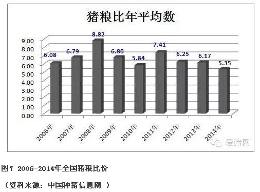 2006年1月-2014年12月,全國豬糧比價走勢中,2008年3月豬糧比價處于歷史最高位,達(dá)到10.08:1;2014年4月份豬糧比價為4.50:1,為近9年歷史內(nèi)最低位。2006年、2007年、2008年、2009年,這四年豬糧比價波幅最大,除此4年,豬糧比價多分布在5:1至7:1之間。另外,2010年和2011年豬糧比價波幅相對較大。