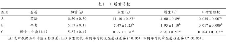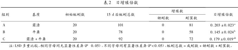 先在每個(gè)養(yǎng)殖盆底部放1層紗網(wǎng),防止蚯蚓逃逸,將土壤裝到養(yǎng)殖盆內(nèi)1/2左右時(shí),放入體重、大小基本一致的蚯蚓20條,然后補(bǔ)充土壤到養(yǎng)殖盆容積的2/3。最后分別稱取菌渣、牛糞、菌渣+牛糞(1∶1)各100g放在土壤上方,輕拍以保持水分。根據(jù)氣溫的不同,每隔3~5天澆水1次,用霧狀噴水器從養(yǎng)殖盆上方緩慢噴入,噴入的水經(jīng)基質(zhì)滲入到土壤中,保持基質(zhì)和土壤含水量在70%左右。保持陰暗通風(fēng)的飼養(yǎng)環(huán)境,用帶有透氣孔的蓋子蓋上。每隔5d添加1次基質(zhì),試驗(yàn)分A、B、C3組,每個(gè)組設(shè)3個(gè)重復(fù)。經(jīng)過30 d 的環(huán)境適應(yīng)性飼養(yǎng)后,分別測(cè)量蚯蚓初重,清除蚓繭和幼蚓,再經(jīng)過15d試驗(yàn)期,將養(yǎng)殖盆中的土壤緩慢倒出,挑出成蚓、幼蚓和蚓繭,并記錄試驗(yàn)數(shù)據(jù)。采取日增重倍數(shù)和日增殖倍數(shù)評(píng)價(jià)蚯蚓的增長(zhǎng)和繁殖情況。公式如下:日增重倍數(shù)=(養(yǎng)殖一定時(shí)間后蚯蚓總重-初始蚓重)/(初始蚓重×養(yǎng)殖時(shí)間)日增殖倍數(shù) = (養(yǎng)殖一定時(shí)間后蚯蚓總數(shù)-初始蚯蚓數(shù)) /(初始蚯蚓數(shù)×養(yǎng)殖時(shí)間)公式中的蚯蚓總數(shù)包括成蚓數(shù)、幼蚓數(shù)和蚓繭數(shù),1個(gè)繭按1條蚯蚓計(jì)算,養(yǎng)殖時(shí)間以天(d)計(jì),蚓重以克(g)計(jì)。試驗(yàn)數(shù)據(jù)采用SPSS17.0軟件分析處理。