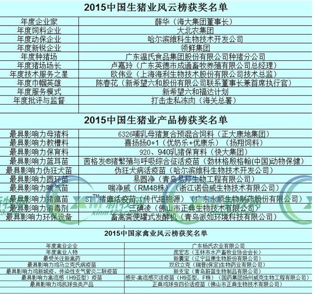 中農(nóng)威特特約2015中國生豬業(yè)/水產(chǎn)業(yè)/家禽業(yè)風(fēng)云榜由南方報(bào)業(yè)傳媒集團(tuán)主辦,南方農(nóng)村報(bào)、農(nóng)財(cái)寶典、新牧網(wǎng)承辦。特別鳴謝品牌合作單位:中農(nóng)威特生物科技股份有限公司,協(xié)辦單位:傲農(nóng)集團(tuán)、播恩集團(tuán)、雙胞胎集團(tuán)、領(lǐng)鮮集團(tuán)、溫氏股份、廣州博善生物飼料有限公司、福州大北農(nóng)生物技術(shù)有限公司。