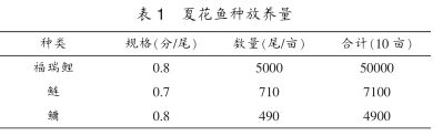 (3)“夏花”投放。福瑞鯉“水花”在5月初從銀川引進,經過25~30天的培育,達到0.7~1.0cm的夏花魚種。然后進行分池飼養(yǎng),以培養(yǎng)各種不同規(guī)格的秋片魚種。配養(yǎng)的花鰱和白鰱是由湖北荊州運來的“水花”培養(yǎng)成的夏花魚種。魚種下塘時是肥水下塘,即池中應有充足的枝角類、橈足類以及搖蚊幼蟲。詳見表1。