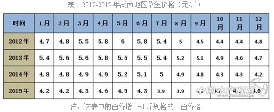 從跟蹤的數(shù)據(jù)(表1)可知,2012-2015年草魚價格基本趨于下行,按價格趨勢預測魚價有上漲的空間,但時間難以確定。