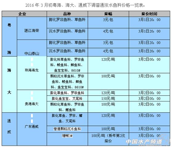1、調(diào)整時間:2016年3月2日00:00開始;2、調(diào)整品種及幅度:(1)普通膨化料:草魚膨化料、羅非膨化料下調(diào)120元/噸,即3元/包;魚寶寶、叉尾膨化料下調(diào)150元/噸,即3元/包;(2)顆粒料:草魚、羅非、鯉魚顆粒料下調(diào)100元/噸,即4元/包。3、高檔膨化料(黃顙料、塘鲺料、生魚料)不作調(diào)整。