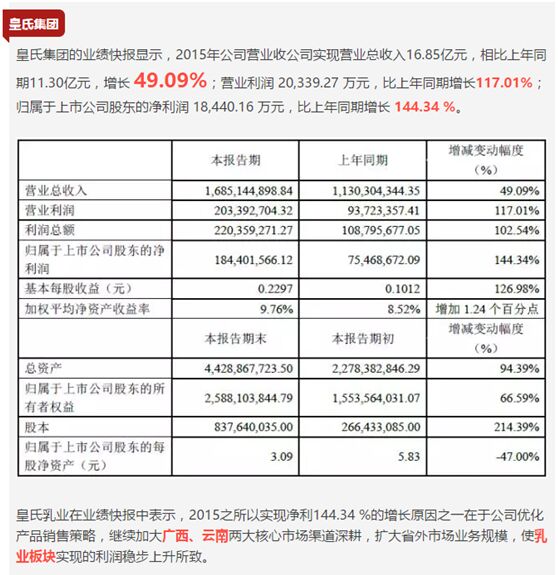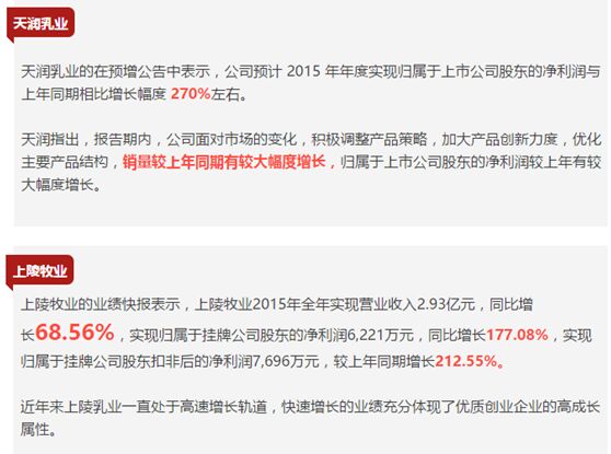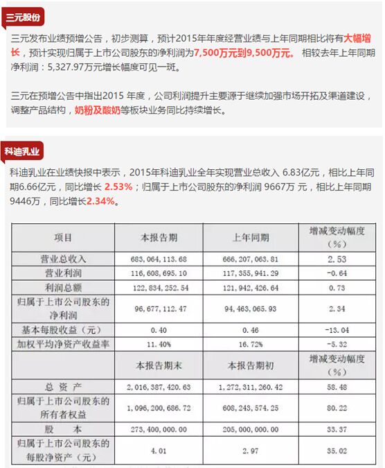 其中貝因美、科迪乳業(yè)、皇氏乳業(yè)、上陵牧業(yè)發(fā)布業(yè)績快報,亮出2015年的成績。三元、天潤、工大高新、金健米業(yè)也紛紛以預(yù)增公告的形式預(yù)告著2015年的收成。