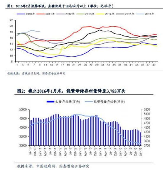 國(guó)泰君安分析師王乾稱(chēng),豬價(jià)“淡季不淡”,江西、湖南、福建等南方地區(qū)突破節(jié)前高點(diǎn)。從歷史經(jīng)驗(yàn)上來(lái)看,春節(jié)后伴隨需求走弱,豬價(jià)面臨一定的調(diào)整壓力。然而,2016年春節(jié)后豬價(jià)小幅回調(diào)后,仍維持在18元/公斤的高位,創(chuàng)下近5年同期的最高水平。生豬供給收縮效應(yīng)凸顯,預(yù)計(jì)豬價(jià)有望重新進(jìn)入上漲通道。