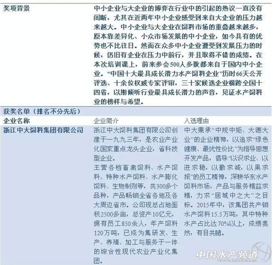 本次水產(chǎn)飼料高級配方師培訓課,除了以“創(chuàng)新至尚、服務到底”為主題討論技術與服務對于飼料企業(yè)發(fā)展意義所在之外,培訓課上同時舉行了“中國十大最具成長潛力水產(chǎn)飼料企業(yè)”頒獎典禮。據(jù)介紹,此次培訓班聯(lián)手《水產(chǎn)前沿》雜志推出這個獎項,主要目的是鼓勵并支持中小企業(yè)未來發(fā)展。