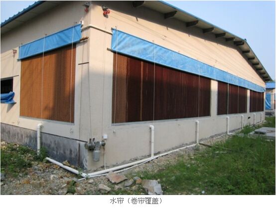 縱向通風(fēng)系統(tǒng)是由大風(fēng)機(54寸、50寸、36寸等)和水簾(濕簾)共同作用,室外的熱空氣通過循環(huán)冷水的濕簾達到一定的降溫后(平均降低約5~6攝氏度)并且在舍內(nèi)形成一定的風(fēng)速,達到一種風(fēng)冷效應(yīng)(豬只體感溫度會降低2~3度)的模式。(附圖一)