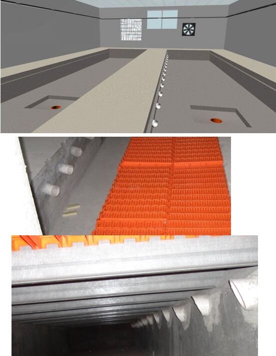 橫向通風(fēng)系統(tǒng)中糞溝排風(fēng)對于改善豬舍空氣質(zhì)量作用明顯。所謂地溝排風(fēng)就是部分污濁/有害氣體有地面以下的連接糞溝的風(fēng)道排除舍外。(附圖三)