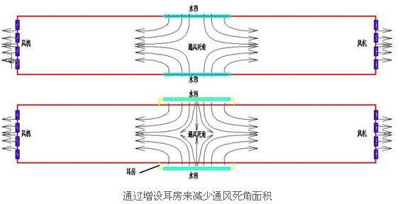 近幾年新建的規(guī)模豬場受到歐美養(yǎng)殖模式影響,豬舍跨度和長度較大(寬度達到30多米,長度超過100米),單棟飼養(yǎng)數(shù)量較多(2000頭以上),這樣的豬舍通風(fēng)設(shè)計時應(yīng)當(dāng)考慮空氣流動的均勻性。降溫需要采用雙縱向模式,即豬舍兩端放置風(fēng)機,中間安裝水簾。若水簾直接安裝在豬舍側(cè)墻上,因豬舍跨度大,經(jīng)過水簾的冷空氣難以到達豬舍中間位置,因此必須把水簾安裝在側(cè)墻外面的耳房上,主體側(cè)墻開小于水簾面積的進風(fēng)口,從而加大進入舍內(nèi)的空氣射流,減少豬舍中間的通風(fēng)死角。(附圖六)
