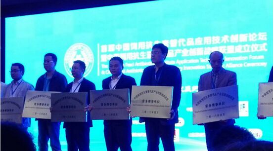 動物營養(yǎng)事業(yè)部副總經(jīng)理陶勝利接受聯(lián)盟授予中國飼用抗生素替代品產(chǎn)業(yè)創(chuàng)新戰(zhàn)略聯(lián)盟“常務(wù)理事單位”授牌儀式(左起第四位陶勝利副總經(jīng)理)
