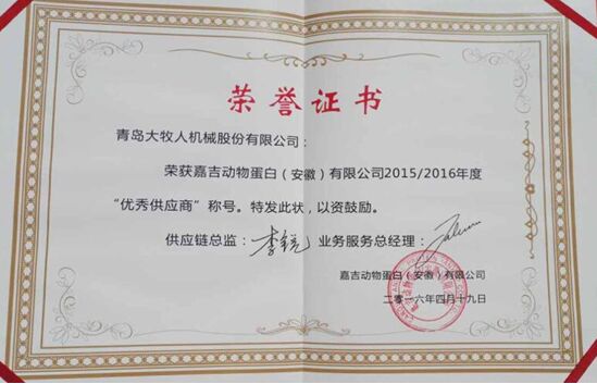 2016年4月19日,嘉吉?jiǎng)游锏鞍祝ò不眨┯邢薰韭≈卣匍_(kāi)2015/2016年度優(yōu)秀供應(yīng)商大會(huì),我公司安徽地區(qū)銷售總經(jīng)理徐惠明與售后服務(wù)經(jīng)理秦明東應(yīng)邀參加此次會(huì)議,會(huì)上嘉吉(安徽)相關(guān)負(fù)責(zé)人對(duì)2015年進(jìn)行了回顧與總結(jié),并與各大供應(yīng)商分享嘉吉2016年度的愿景與發(fā)展。會(huì)議重要環(huán)節(jié)是對(duì)優(yōu)秀供應(yīng)商進(jìn)行表彰,大牧人榮獲嘉吉“2015/2016年度優(yōu)秀供應(yīng)商”稱號(hào),是僅有的兩家養(yǎng)殖設(shè)備優(yōu)秀設(shè)備供應(yīng)商之一。