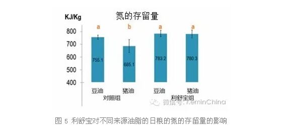 4. 豬油型日糧會(huì)影響氮的消化和吸收,添加利舒寶可以顯著提高豬油型日糧氮的存留,相比對(duì)照組氮的存留量提高了13.90%;