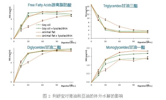 從圖2的利舒寶對(duì)不同來(lái)源的油脂體外試驗(yàn)的結(jié)果來(lái)看,添加利舒寶可以顯著提高豆油和豬油的水解效率。相比利舒寶對(duì)豆油的水解效率的提升來(lái)看,添加利舒寶對(duì)豬油的提升效果要顯著優(yōu)于豆油。在沒(méi)有使用利舒寶的條件下豬油的水解效率要低于豆油(圖1),但是當(dāng)使用利舒寶之后豬油的水解效率在一定程度上達(dá)到甚至要優(yōu)于豆油。
