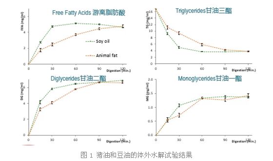 從圖1的豬油和豆油的體外水解試驗(yàn)結(jié)果我們可以看出:豆油的水解效率要顯著高于豬油的水解效率(游離脂肪酸、甘油一酯和甘油二酯的水平越高說(shuō)明油脂的水解效率越高,同理當(dāng)甘油三酯的水平越低說(shuō)明油脂的水解效率越高)。