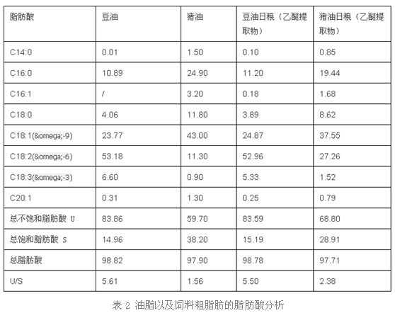 1. 豬油和豆油的脂肪酸譜和U/S存在很大的差異,外源添加豬油和豆油日糧的脂肪酸譜和U/S同樣也存在很大的差異;