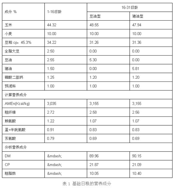 油脂來(lái)源與利舒寶在肉雞飼料中的相互作用 1 消化代謝試驗(yàn)設(shè)計(jì): 試驗(yàn)分為豆油型日糧和豬油型日糧,以及在豆油和豬油型日糧的基礎(chǔ)上分別添加500g利舒寶。
