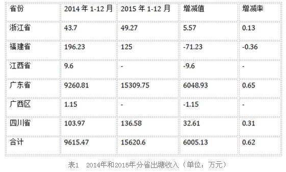 2015年投放淡水鱸魚魚苗4419.8萬尾,比2014年的2113.2萬尾,增加2306.6萬尾,增加率為109%;投苗費用361.48萬元,比2014年244.56萬元,增加116.92萬元,增加率為48%。廣東和河北兩省增加較多。