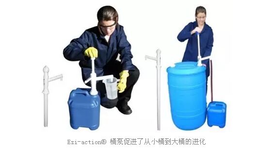 從前的盛裝化學(xué)藥劑的桶大多是20L,主要是為了方便取用,即便是用20L桶傾倒液體也是一個體力活。如果是大號桶那就必須使用泵了,因為抬起200L的大桶傾倒液體顯然是不現(xiàn)實的。而當(dāng)時市面上的桶泵總會有各式各樣缺點:密封性不足、安全性不足、費力、浪費液體等等。正是Ezi-action® 桶泵的問世,使得200L大桶實用性大大提升,而牧場和企業(yè)也因為使用大桶和桶泵提高了效率,節(jié)省了成本。