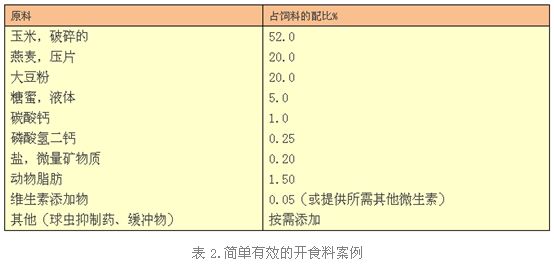 以上的飼料以干物質(zhì)為基準(zhǔn)含有18%的粗蛋白和80%的總可消化養(yǎng)分(TDN)。這種配方是簡(jiǎn)單、有效的。如果再加入玉米和燕麥并做成顆粒(通常玉米是以整粒形式添加),就能成為非常好的開(kāi)食料。