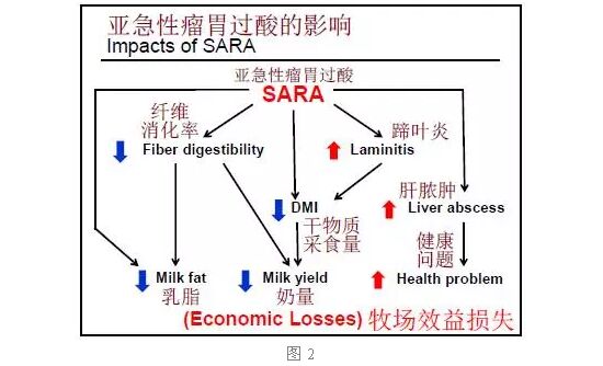 瘤胃pH值介于5.2~5.8之間(如圖1陰影部分),叫作亞急性瘤胃過酸(或亞臨床性瘤胃過酸)。亞急性瘤胃過酸和臨床性瘤胃過酸不一樣,臨床性瘤胃過酸pH值在5.2以下,馬上會有急性癥狀出現(xiàn)。亞急性瘤胃過酸或瘤胃過酸雖然不是急性的,但是對奶牛的表現(xiàn)也會有影響。(圖2)