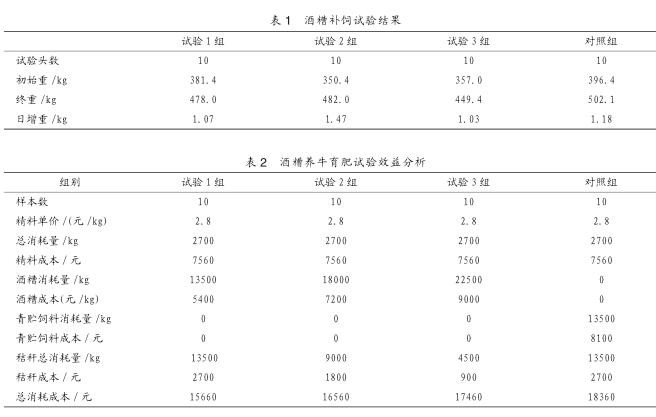 飼喂日糧精料配方為:玉米66%、大北農(nóng)專用預(yù)混料4%、豆餅20%、油枯10%。試驗(yàn)1組日糧組成:酒糟15kg、精料3kg、青草15kg。試驗(yàn)2組日糧組成:酒糟20kg、精料3kg、青草10kg。試驗(yàn)3組日糧組成:酒糟25kg、精料3kg、青草5kg。對照組日糧組成:青貯料15kg、精料3kg、青草15kg??傇囼?yàn)期均為3個月,試驗(yàn)完成后進(jìn)行體重測定并進(jìn)行對比分析。記錄每月每頭平均消耗精料及青、粗飼料量。