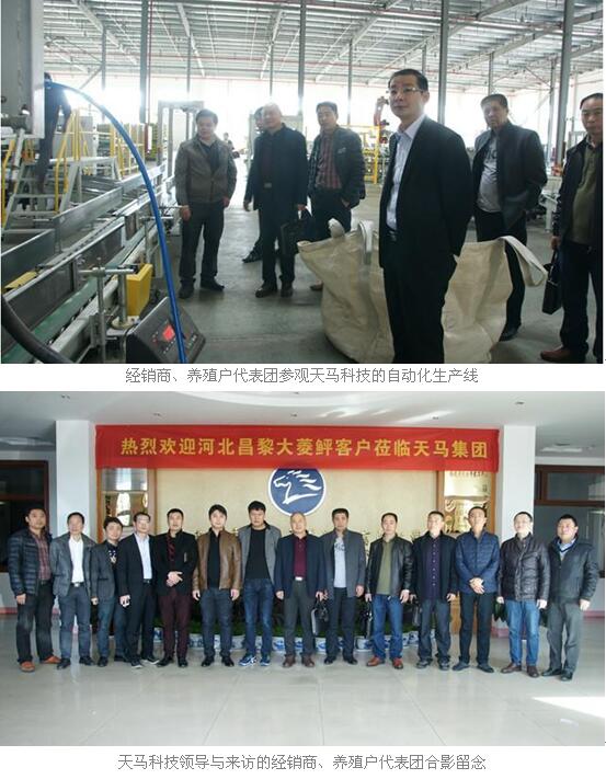 12月18日,河北省秦皇島市昌黎縣大菱鲆配合飼料經(jīng)銷商王闖先生、張麗翠女士及大菱鲆養(yǎng)殖戶代表李兵先生、劉成濤先生、佟永先生、徐輝女士、陳學(xué)彬先生、侯建昌先生、劉成利先生、秦靖仙先生組成代表團(tuán)蒞臨天馬科技參觀考察,并與天馬科技達(dá)成2017年度合作意向。天馬科技營(yíng)銷服務(wù)中心林成長(zhǎng)總監(jiān)、研發(fā)中心張蕉南總監(jiān)、生產(chǎn)管理中心陳金忠副總監(jiān)和北方事業(yè)部古田總經(jīng)理等領(lǐng)導(dǎo)熱情接待。