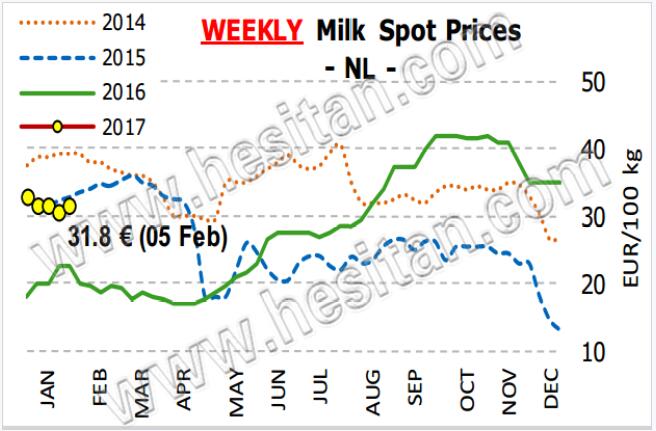 荷蘭方面由于環(huán)境新政策,奶農(nóng)可能面臨這縮減牛群或者減產(chǎn)的壓力。12月收奶量大幅下降,跌幅超過8%,但是由于第一二季度增幅較大,因此全年同比增加7%。1月份,荷蘭牛奶生產(chǎn)環(huán)比保持穩(wěn)定,價(jià)格略微上漲。奶農(nóng)和乳品企業(yè)依然沒有采取行動(dòng),采取觀望態(tài)度等待3月1日的到來。