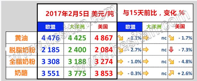 2017年1月是一個(gè)平靜的月份,西方各國都在假期之中,而中國也將迎來春節(jié),因此一月份全球乳品市場十分平靜,各大乳品交易平臺(tái)顯示價(jià)格沒有大幅波動(dòng)。另外,北半球進(jìn)入牛奶季節(jié)性增產(chǎn)階段,各國數(shù)據(jù)顯示1月份產(chǎn)奶量相對(duì)12月份都有不同程度上升,對(duì)牛奶供給短缺也產(chǎn)生了一定的緩解。以上因素導(dǎo)致了1月份價(jià)格指數(shù)保持穩(wěn)定。