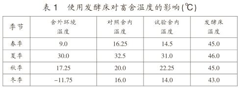 (1)畜舍溫度。如表1所示,使用發(fā)酵床后,冬季和春季舍內溫度變化幅度較小,在沒有采取人工采暖的情況下,冬春季舍內溫度維持在14.0℃。對照組舍內溫差變化較大,受舍外溫度和人工采暖的影響明顯。在采取人工采暖的情況下,冬季舍內溫度為16℃。采用發(fā)酵床養(yǎng)豬,在冬季與春季不僅可以節(jié)約能源,也可保持畜舍環(huán)境溫度。夏季和秋季由于全天開窗通風,舍內外溫度差異不明顯。