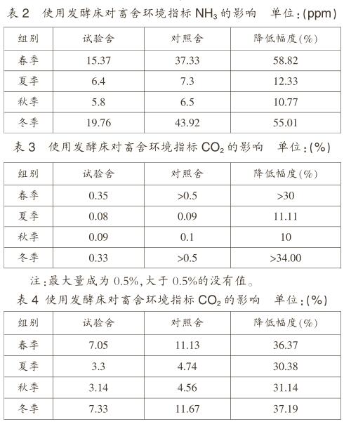 (2)畜舍環(huán)境指標。如表2、3、4所示,夏、秋季節(jié)全天通風,雖然氣體環(huán)境指標無明顯差異,但是該指標仍低于對照組值;冬、春季節(jié)試驗舍空氣中的NH3、CO2和H2S明顯低于對照組,降幅均超過30%。