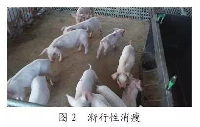 發(fā)病迅速,感染病原后幾天內(nèi)就發(fā)病。出現(xiàn)體溫高、反應(yīng)遲鈍,運(yùn)動時(shí)或迫起時(shí)發(fā)出尖叫疼痛(見圖1),某些豬由于發(fā)生腦膜炎而表現(xiàn)肌肉震顫、麻痹、驚厥。病豬四肢關(guān)節(jié)腫大,跛行,顫抖,共濟(jì)失調(diào),可視黏膜發(fā)紺,眼睛灰色或褐色,個別有眼球突出,而后漸行性消瘦(見圖2),最后死亡,從發(fā)病到死亡時(shí)間較長。