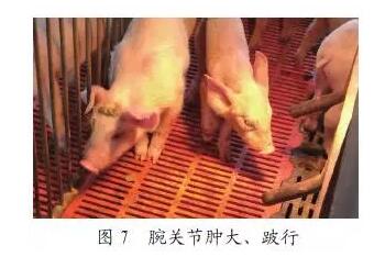 關(guān)節(jié)型鏈球菌腕關(guān)節(jié)發(fā)病居多(圖7),關(guān)節(jié)腔積液是化膿型,比較濃稠,色澤深。關(guān)節(jié)腫大,初期堅(jiān)硬、溫度升高,后期變軟,觸之有波動感,針刺流膿,有時(shí)傷口破潰后膿汁會自動流出;少數(shù)變硬、皮膚增厚;剖檢滑液渾濁,有黃白色奶酪樣塊狀物,關(guān)節(jié)周圍皮下膠樣水腫,有化膿性壞死灶,嚴(yán)重者關(guān)節(jié)軟骨壞死。
