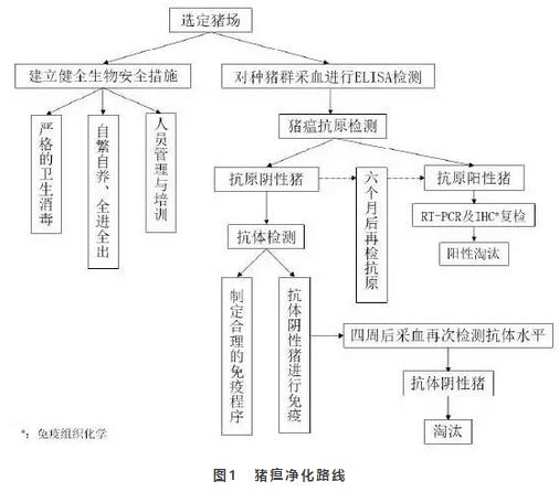 豬場(chǎng)豬瘟防控的最終目標(biāo)是實(shí)現(xiàn)豬瘟的凈化,通過(guò)豬瘟抗體與抗原檢測(cè)的聯(lián)合應(yīng)用,持續(xù)監(jiān)測(cè)后備母豬群豬瘟病毒帶毒狀態(tài),確定帶毒豬、免疫麻痹豬以便及時(shí)淘汰處理,逐步實(shí)現(xiàn)后備母豬群豬瘟的凈化。豬瘟凈化路線見(jiàn)圖1。