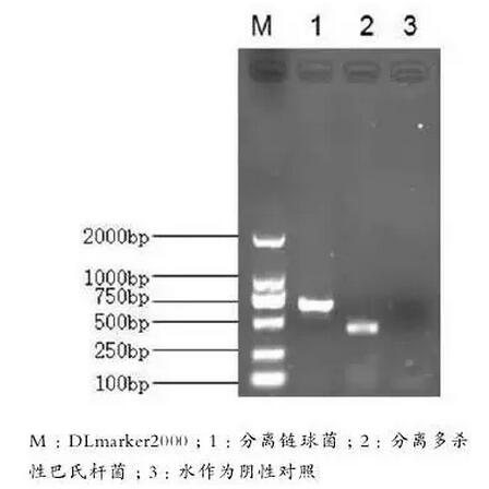 根據(jù)參考文獻(xiàn),利用PCR方法,擴(kuò)增疑似為豬鏈球菌、多殺性巴氏桿菌的特異性片段,結(jié)果顯示擴(kuò)增出豬鏈球菌689bp特異性片段、多殺性巴氏桿菌457bp片段,與預(yù)期一致(圖6),表明分離兩種細(xì)菌為豬鏈球菌和多殺性巴氏桿菌。