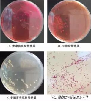 用注射器無(wú)菌采取心包纖維素性滲出物,在無(wú)菌超凈工作臺(tái)中進(jìn)行細(xì)菌分離,分別接種到麥康凱瓊脂、SS瓊脂、普通營(yíng)養(yǎng)瓊脂培養(yǎng)基上,經(jīng)24h培養(yǎng)箱培養(yǎng)可見(jiàn)到細(xì)菌的生長(zhǎng),見(jiàn)圖2A~C。用接種環(huán)挑取營(yíng)養(yǎng)瓊脂培養(yǎng)基上的單個(gè)菌落進(jìn)行革蘭氏染色,在電鏡下觀察可見(jiàn)革蘭氏陰性短桿菌,見(jiàn)圖2D。